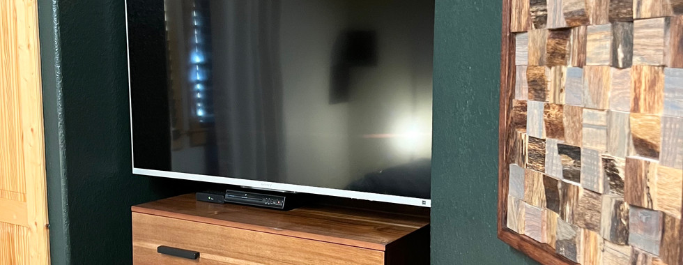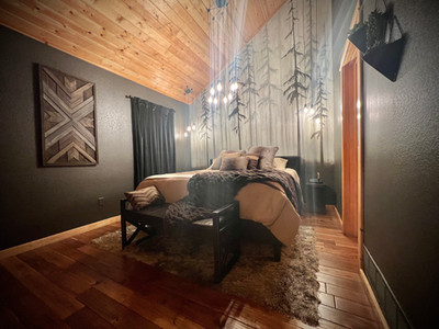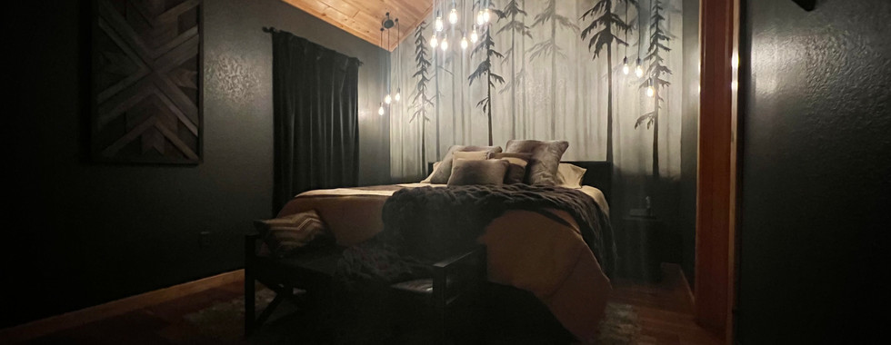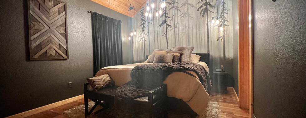 Danielle painted two murals in the condo. The first can be seen as you walk upstairs to one of the bedrooms. It is a beautiful vintage-inspired mural of a Rocky Mountain National Park print. The second mural is the focal point in the other bedroom. This darker treescape mural gives the bedroom a perfect mountain getaway vibe!